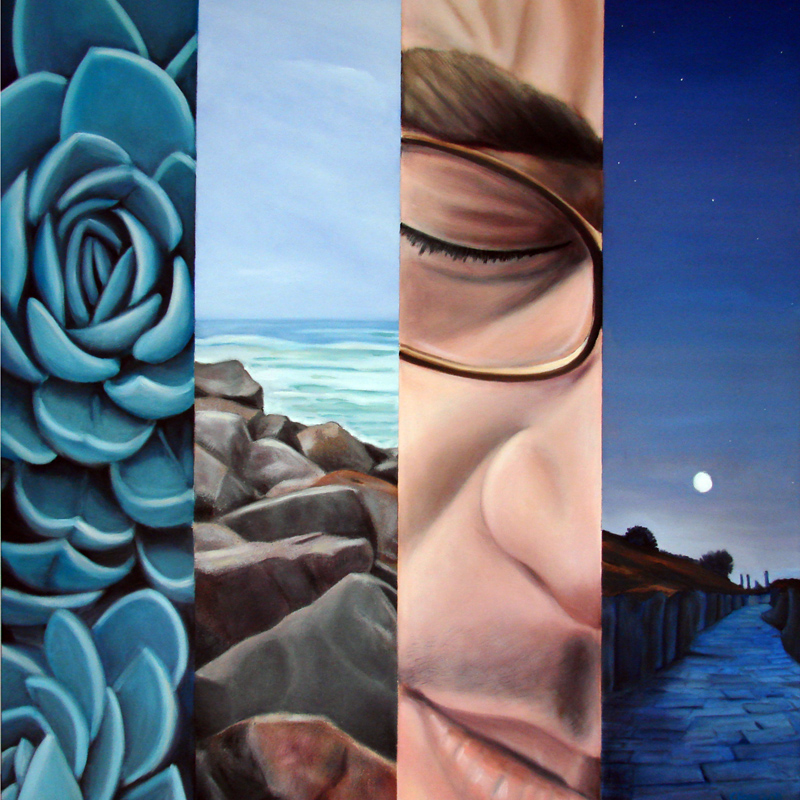 This particular work was done to suggest a sort of dream state. A couple of the images are scenes that have reoccurred in dreams of mine, coastlines and dark, stony paths that lead to some unknown locale. The blue plant and the man’s face should convey serenity and fatigue, or something like that. As with all my paintings, make of them what you will.