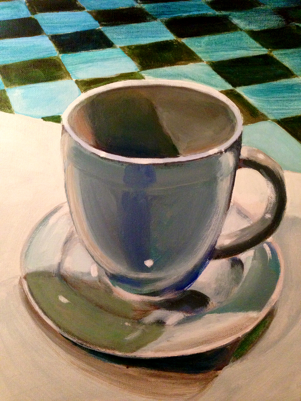 I’ve been reading a book on the artist Wayne Thiebaud and since I am on a still life kick at the moment, I have really taken to Thiebaud’s use of light and color. One thing Thiebaud talks about is his tendency to stylize shadows (he refers to this technique as a caricature). I’ve had this notion in the back of my mind as I sketched this version of the tea cup, which I originally drew in pencil a few weeks ago seen here on this blog, using acrylic paint instead of my usual oil set. I find that I have to work faster with the acrylics since they tend to dry much faster which is good in that I don’t worry so much about accuracy so much as just trying to get an image down. I may do some additional studies and play with the colors more before executing an oil version since this goes pretty quickly. I think my writing on this entry is quick and a bit sloppy too, oh well, have to make more of an effort next time.