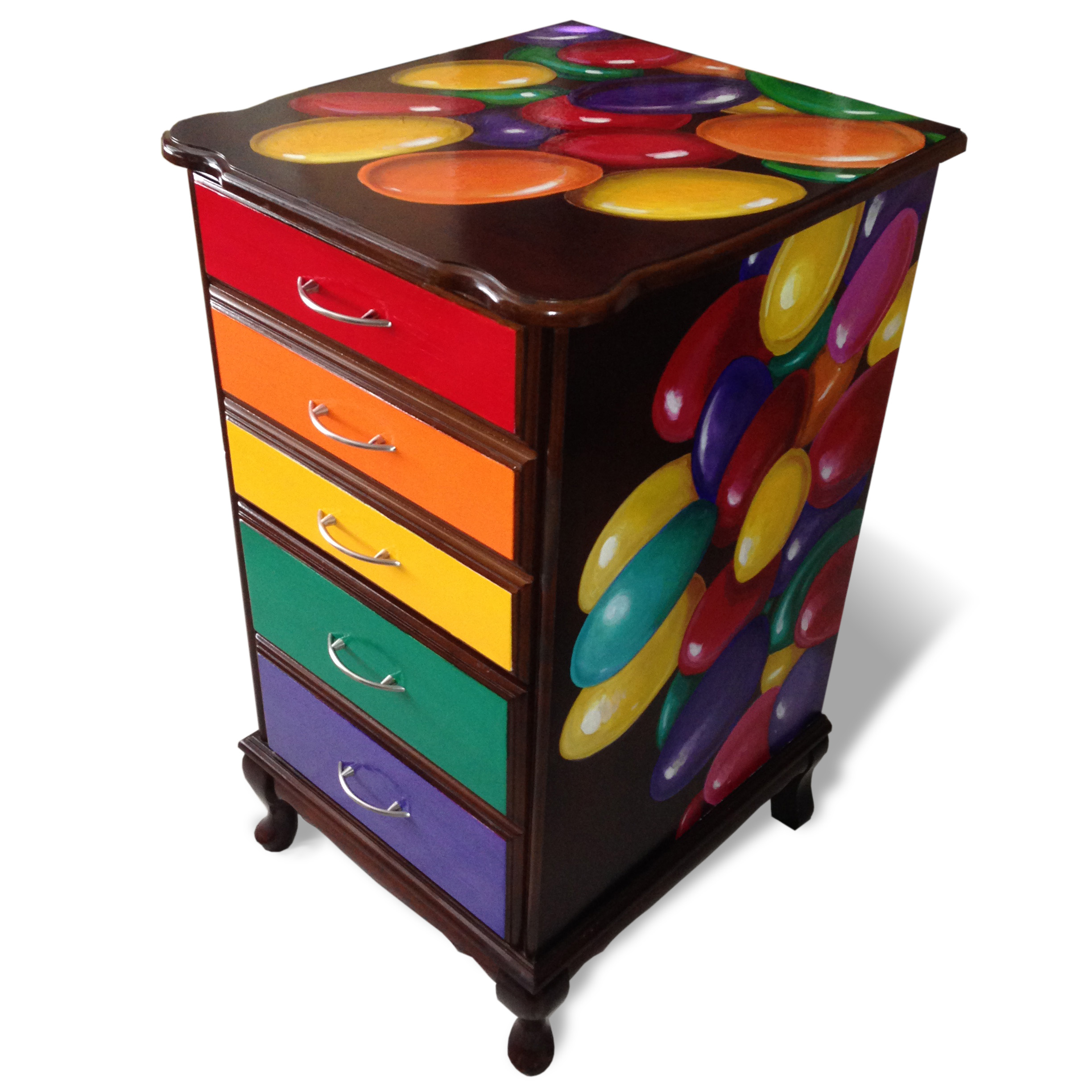 My first post for 2015 is a pro-bono piece done for The Furniture Bank of Metro Atlanta (www.furniturebankatlanta.org). To raise money for this non-profit organization, they are having an art auction called a “Chairity”, and have asked several local artists to create some artwork on a piece of furniture. So I’m submitting this small drawer cabinet with a jelly bean motif that I’ve used before in some of my earlier paintings. Here’s a some what reverse sequential sequence of the cabinet from finished piece to the original version. The auction titled “Chairish the Future” gala will be on February 27th.
