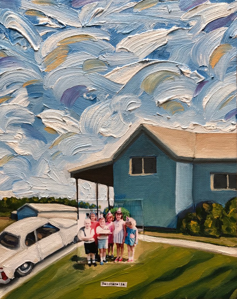1. Excellent piece! I particularly like the pleasantry of the nostalgic neighborhood in contrast with the vibrant and playful sky. I also like that the colors in the clouds are also in the scenic elements below. The placement of the children photo is well incorporated. My eyes are drawn also to the house and car, very well painted. The over all view creates a pleasant moment in time with a certainty of good things (memories) for me. Well done, Mr. Ford!