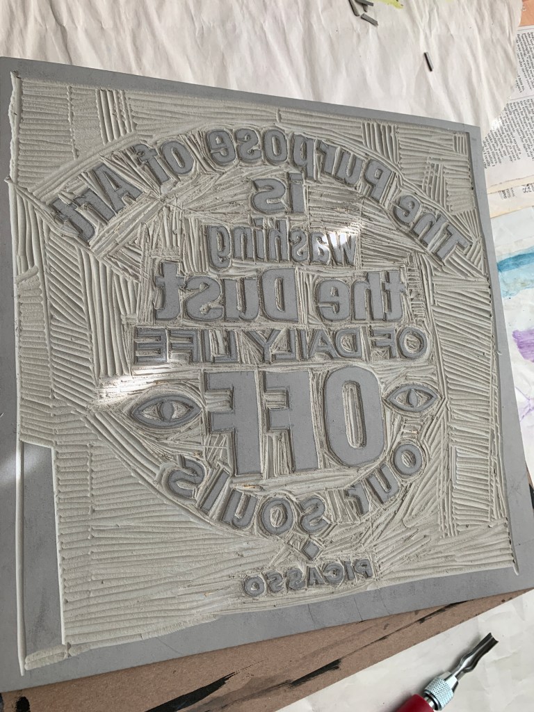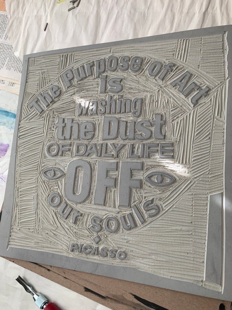 Tags: art class, design class, graphic design, linocut, linoleum cut, linoprints, Picasso quote, type design