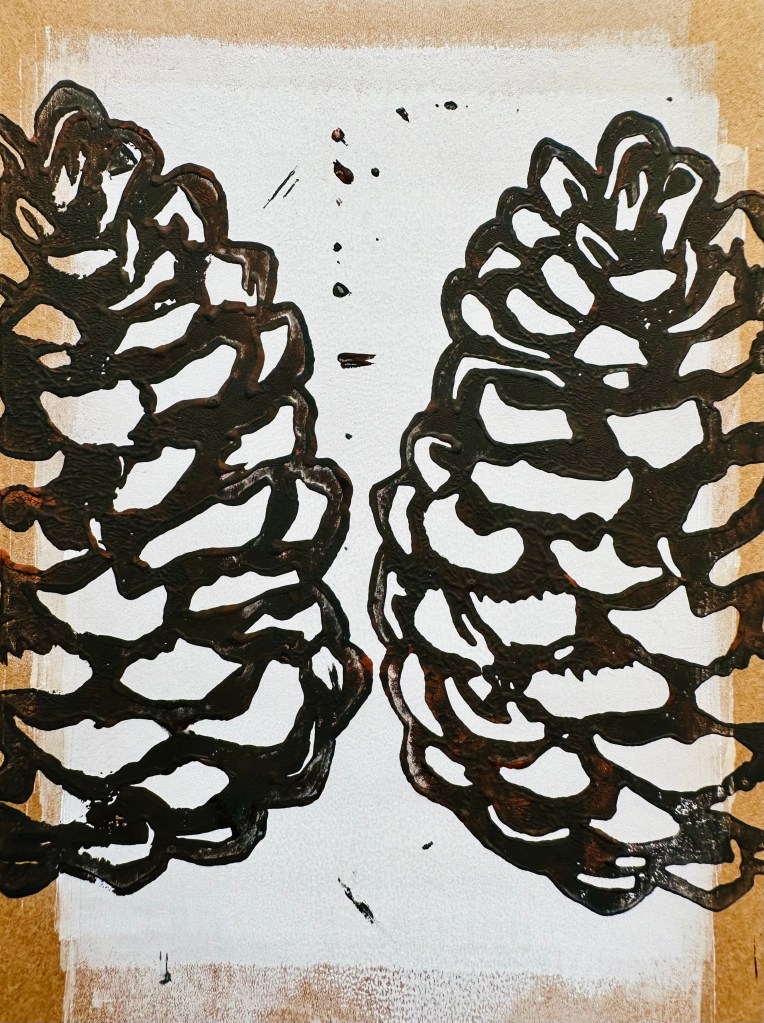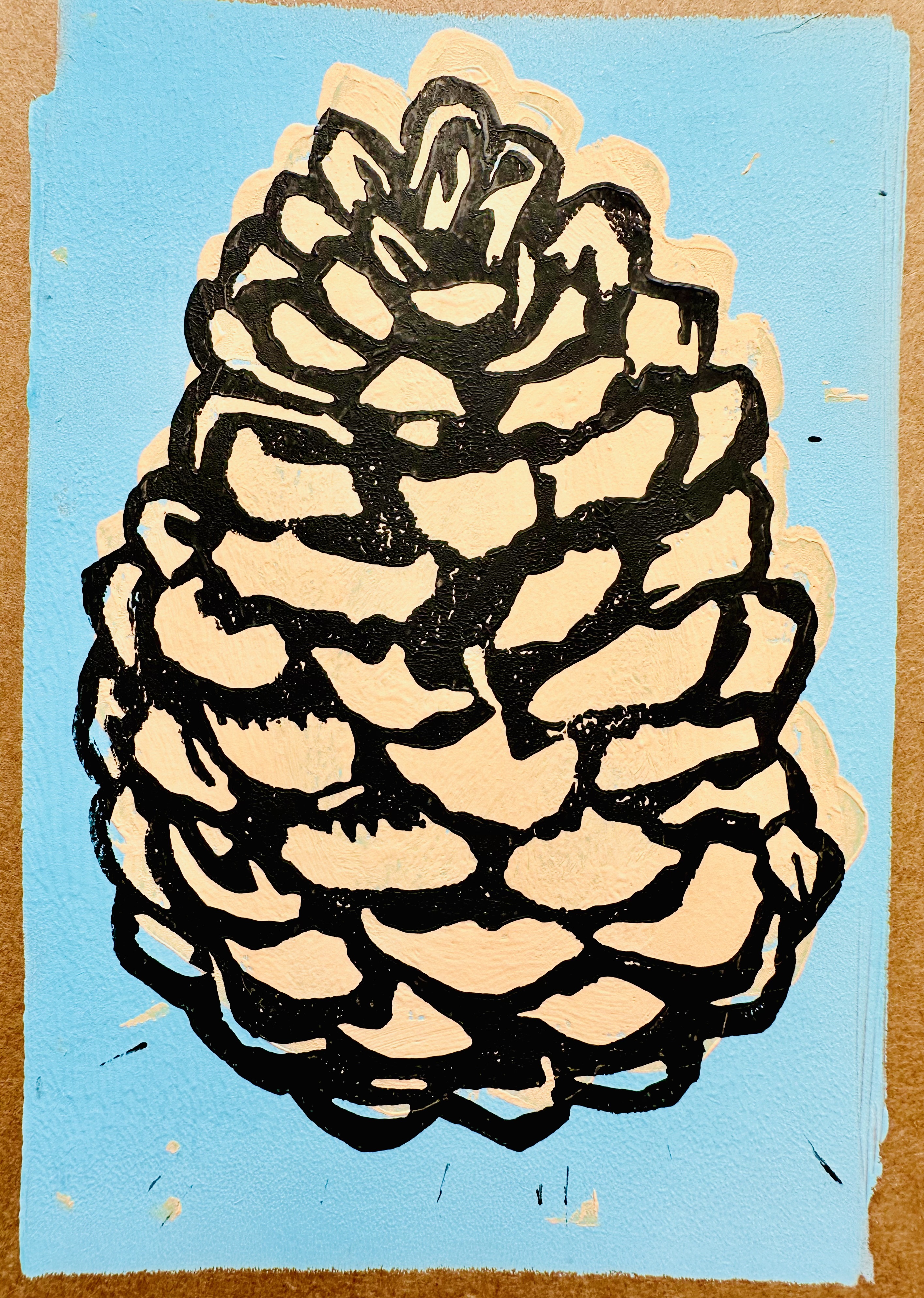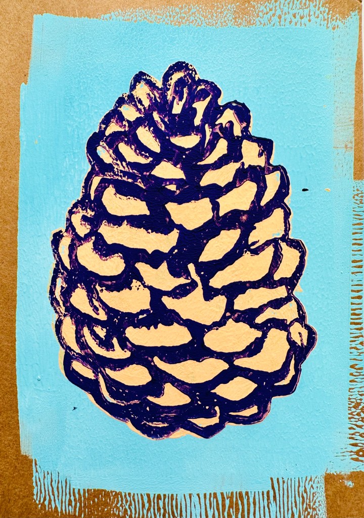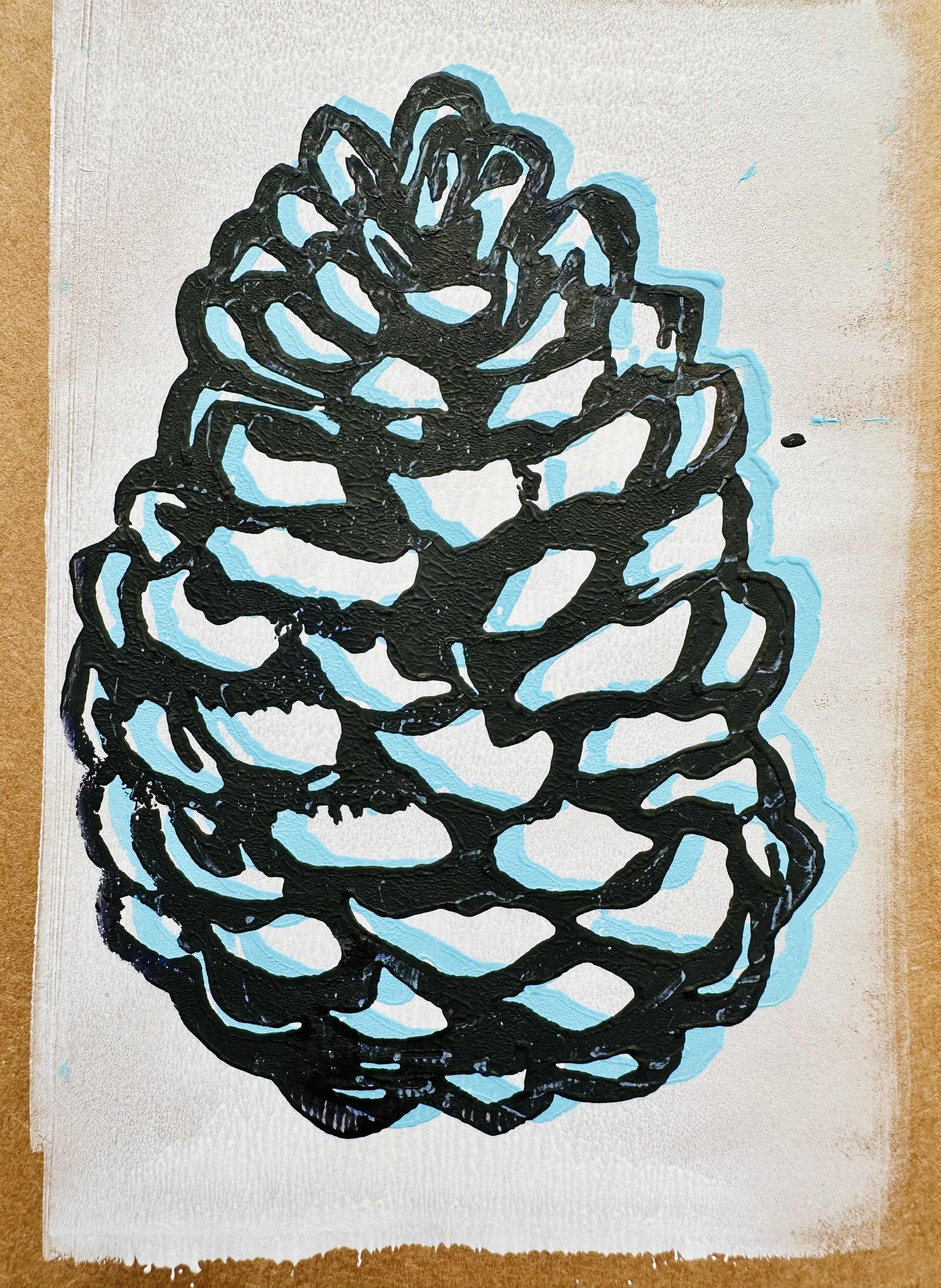 Three-color block print on Kraft card stock. Aqua and Black on a white field. Three-color block print on Kraft card stock. Aqua, Naples Orange, and Black.Two-color block print on Kraft card stock. The “black” lines are a variety of mixed colors on a white field.Three-color block print on Kraft card stock. Aqua, Naples Orange, Purple