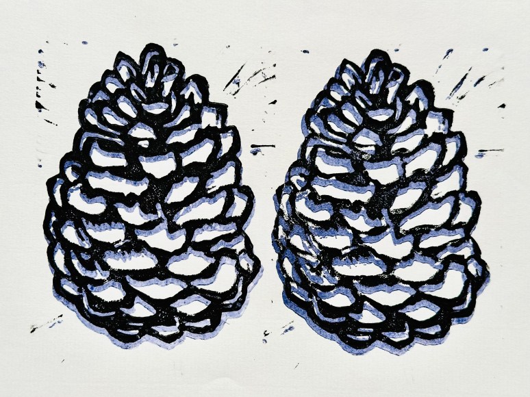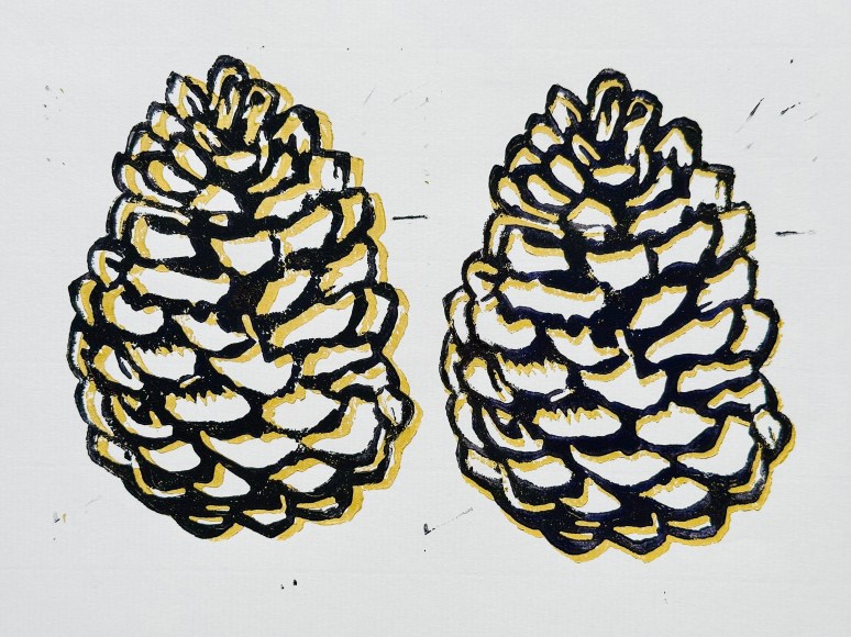 More pine cone block prints on a cold and rainy day
