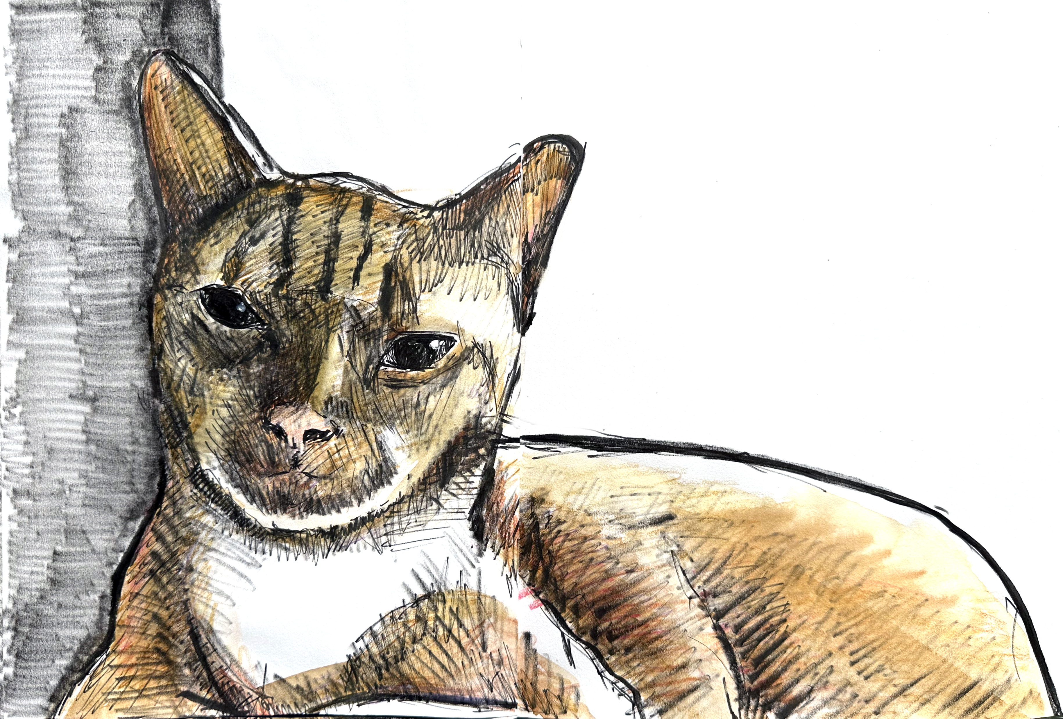 11″ x 17″ sketchbook pen and ink plus watercolor pencils. Not the best pet portrait I’ve done, but it does resemble the new kitty.