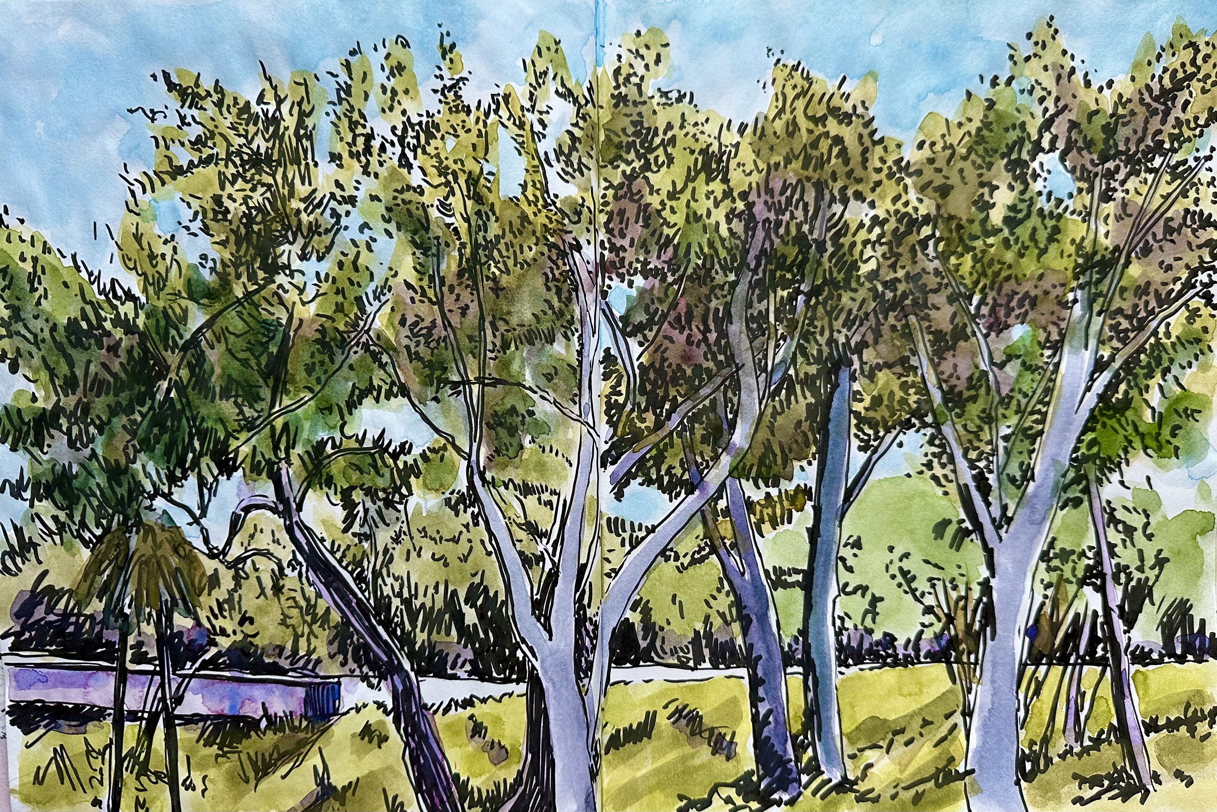 11″ x 17″ sketchbook spread w/brush pen and watercolor