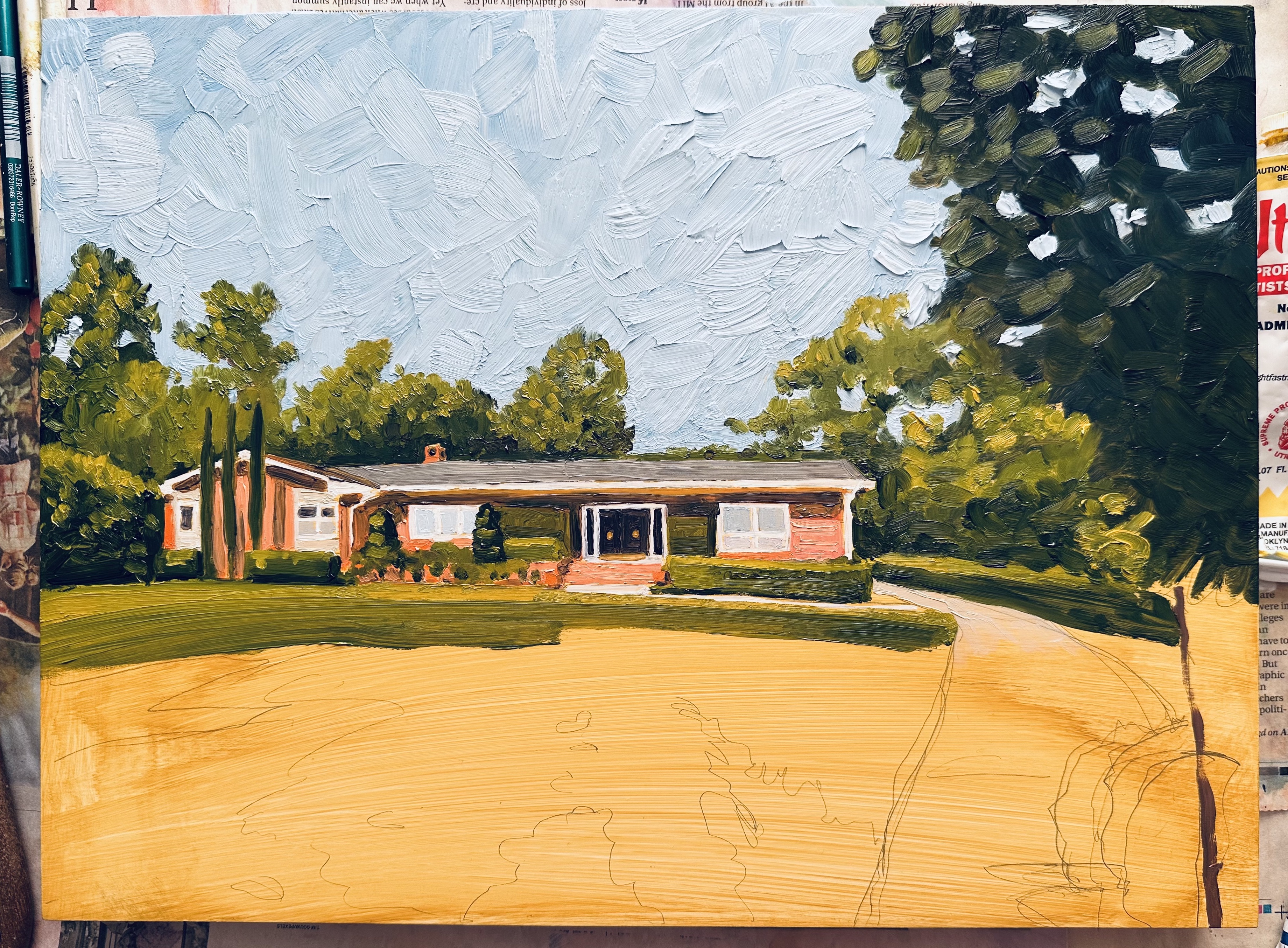 Here’s the next step to this 12″ x 16″ cradled wood panel with a wash of yellow ochre underpainting.