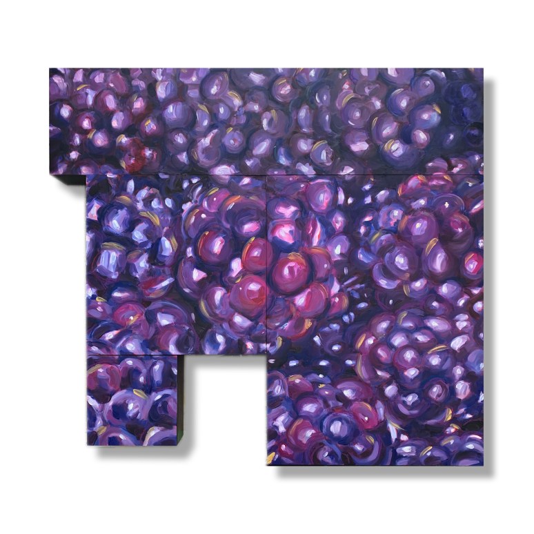 24″ x 22″ x 1.5″ oil paint on various-sized cradled panels A reposting of a “produce series” of assembled painted panels that started with the bananas and was continued with these berries, but never really took off. Something I may come back and pursue.