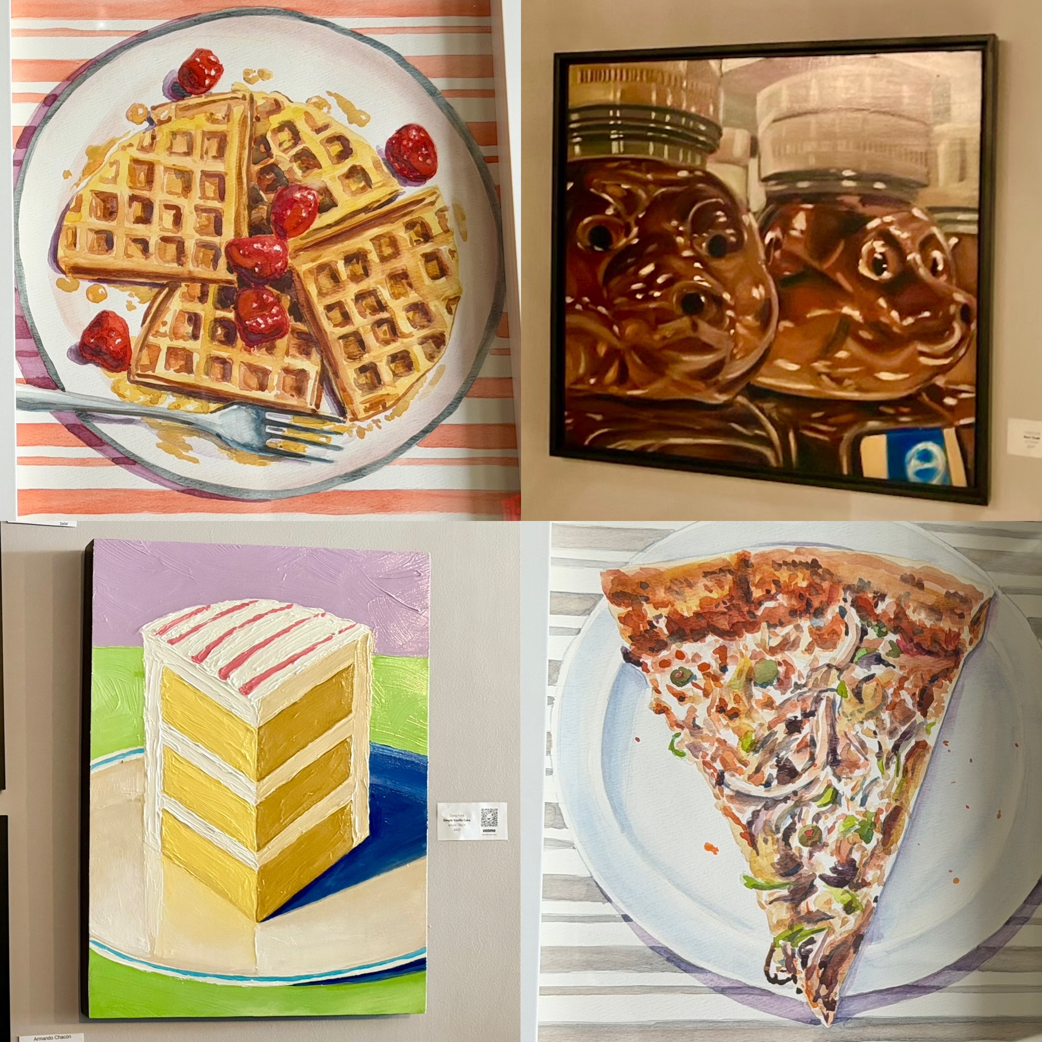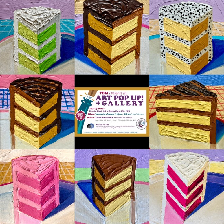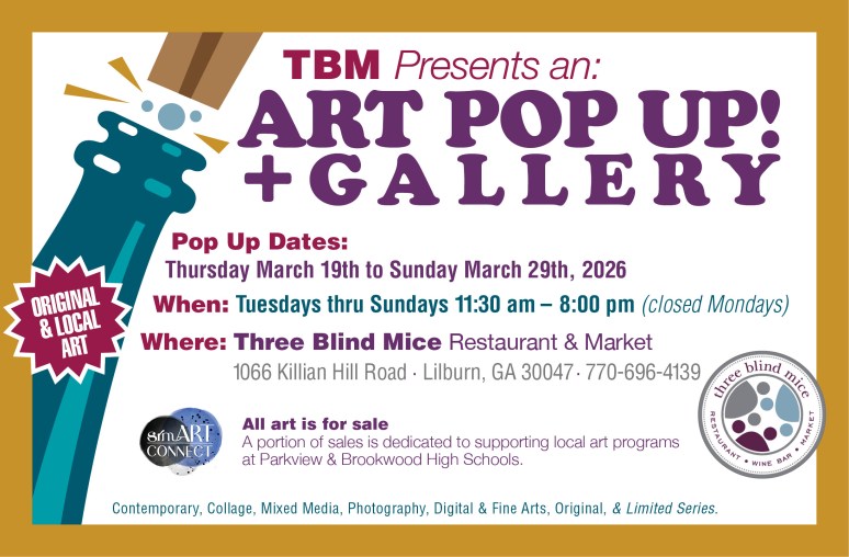 Go for a delicious meal, drink some amazing wine, and take home some beautiful artwork. My food paintings in particular look good on the wall! Three Blind Mice restaurant & Market in Lilburn, GA.