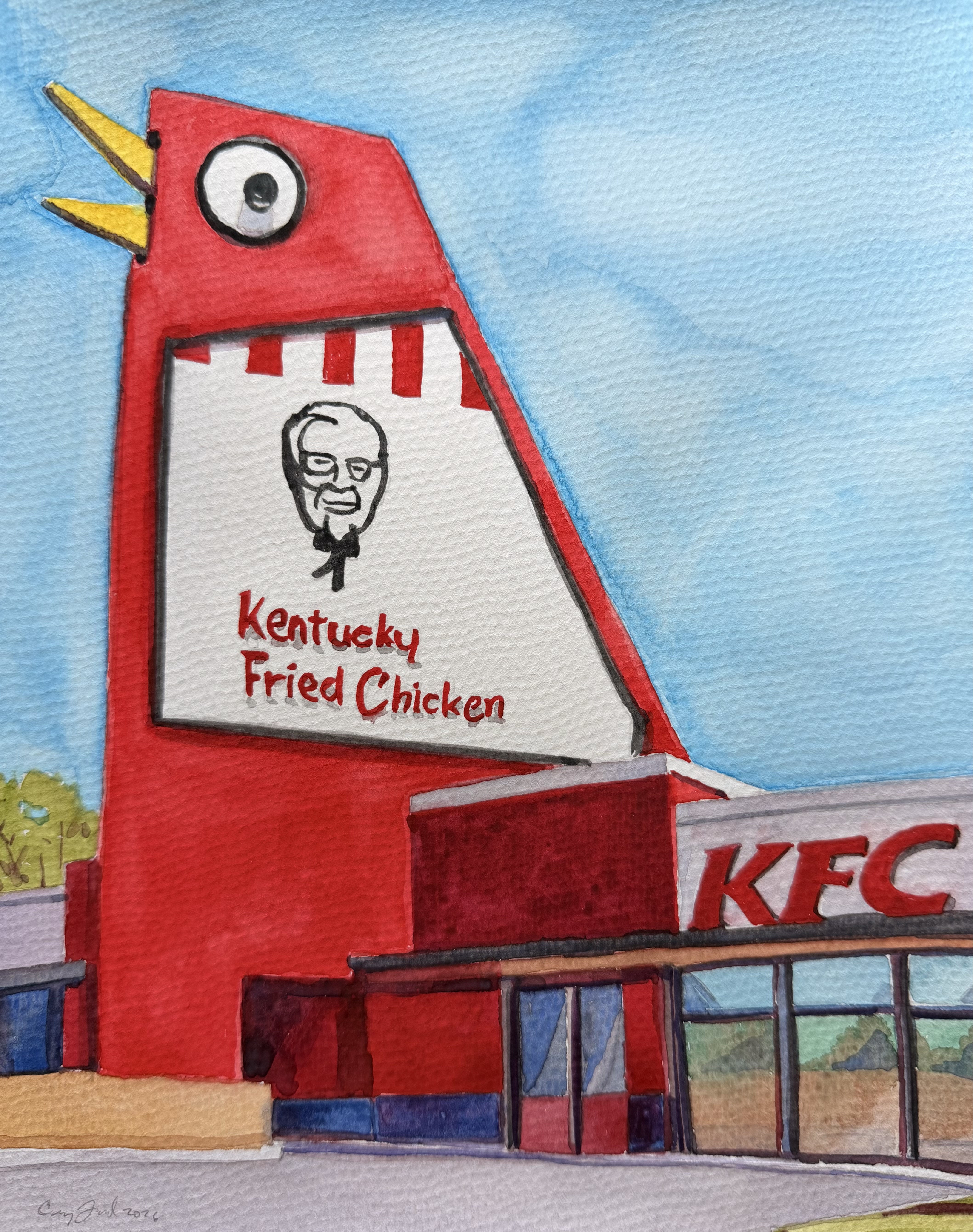 10″x 8″ watercolor on paper, The Big Chicken is a landmark in Marietta, GA. Frequently used as a navigational reference in Cobb County.