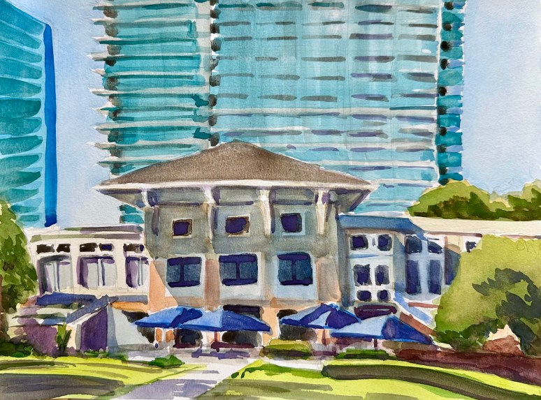 I’ll be “performing” a live painting at a fundraiser tonight, my part is going to be painting a larger 18″x 24″ watercolor with lots of tables and people in this garden area. Hopefully, all goes well and my painting will be auctioned off without a hitch. If it turns out ok, I’ll be posting tomorrow. I may even try “live-casting” on Instagram somewhere between 6:00 & 7:00 pm EST. Check it out if you can! Thx